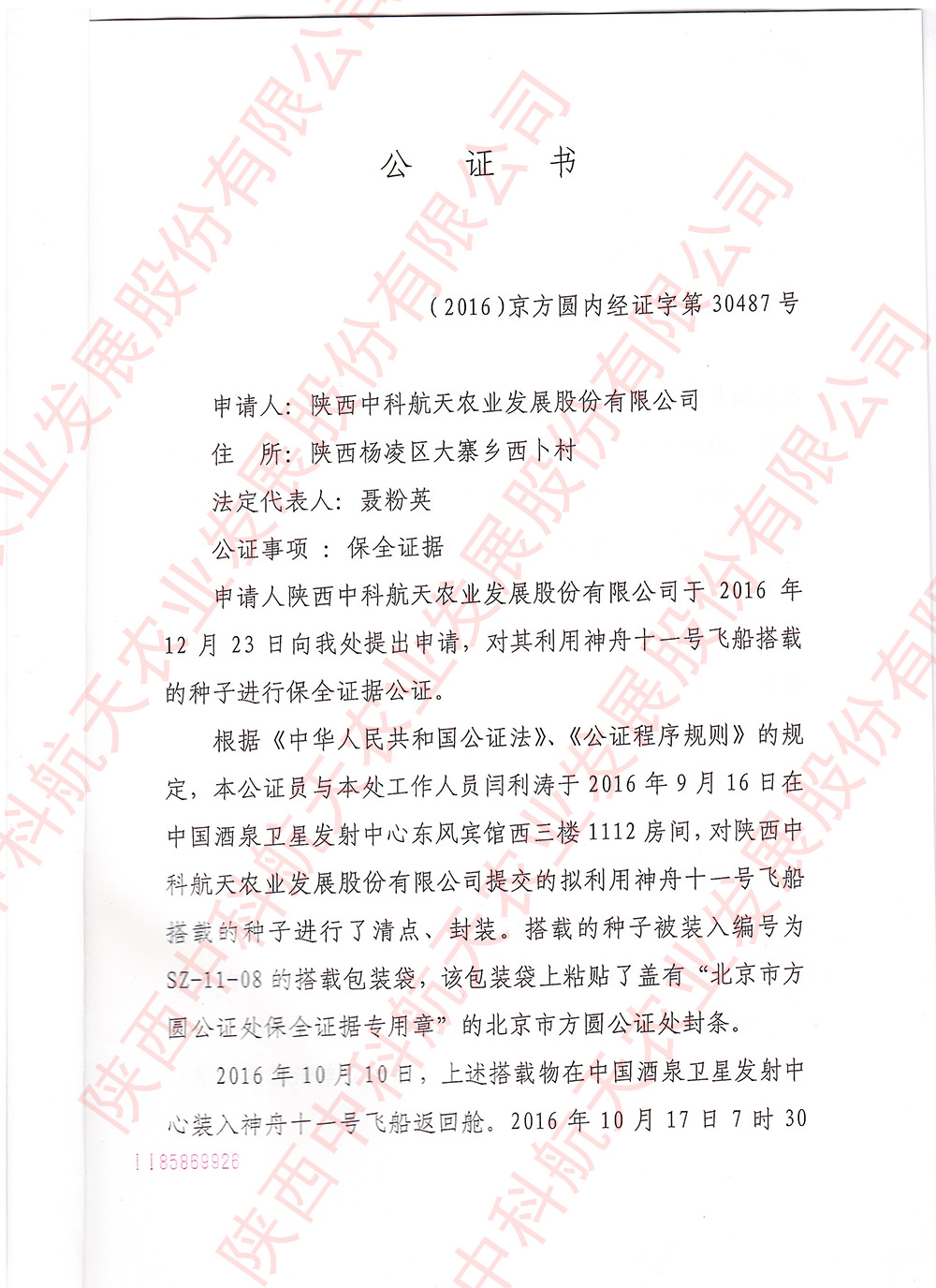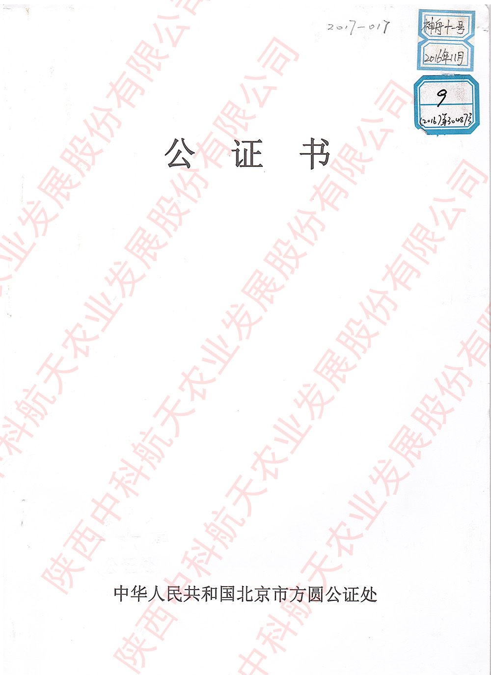 神舟十一號(hào)公證書